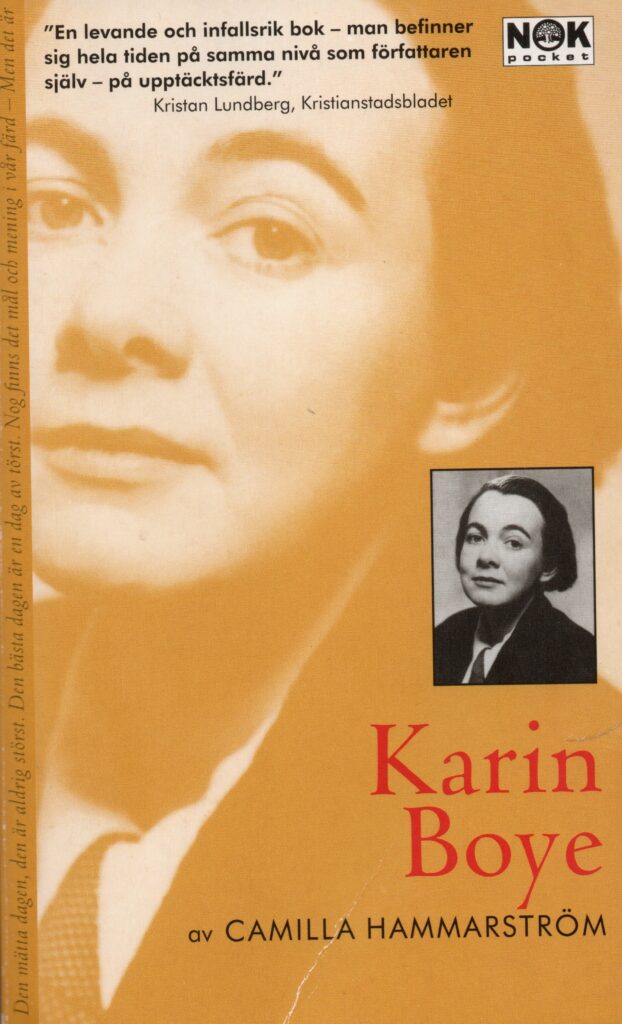 ”Camilla Hammarström har skrivit en biografi över Karin Boye som faktiskt är den första sedan Margit Abenius arbete från 1950. I den hittar man de dolda sidor av Boye som gör henne så mycket intressantare och problematiserar relationen verk – författare genom en speciell ljusteknik. (…) Det är i Boyes romaner som Hammarström gör de intressantaste fynden och presenterar de finaste analyserna. Hennes stil är luftig och njutbar. Det är en värdefull biografi som nyanserar och komplicerar läsningen av den feministiska Boye som såg Ellen Keys moderlighetsprincip som slumrande i var människa och den politiska Boyes analyser av tredje rikets litteratursyn och fascismens lockelse.”
